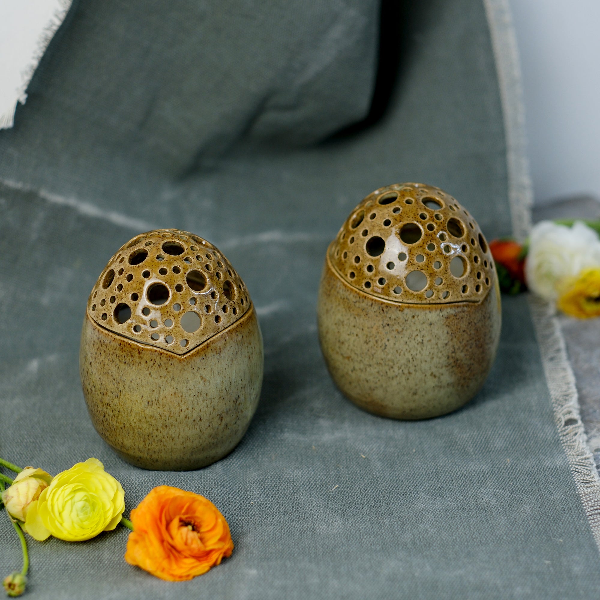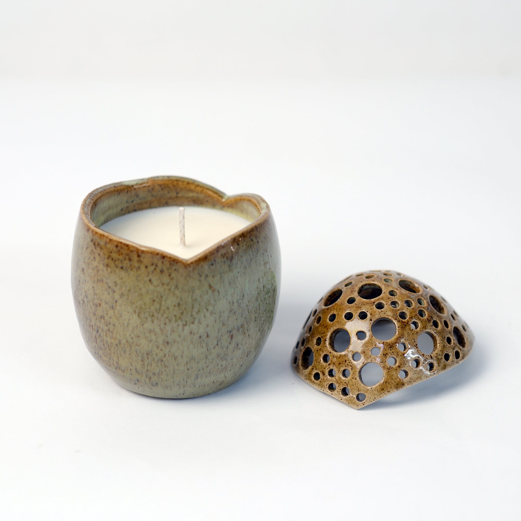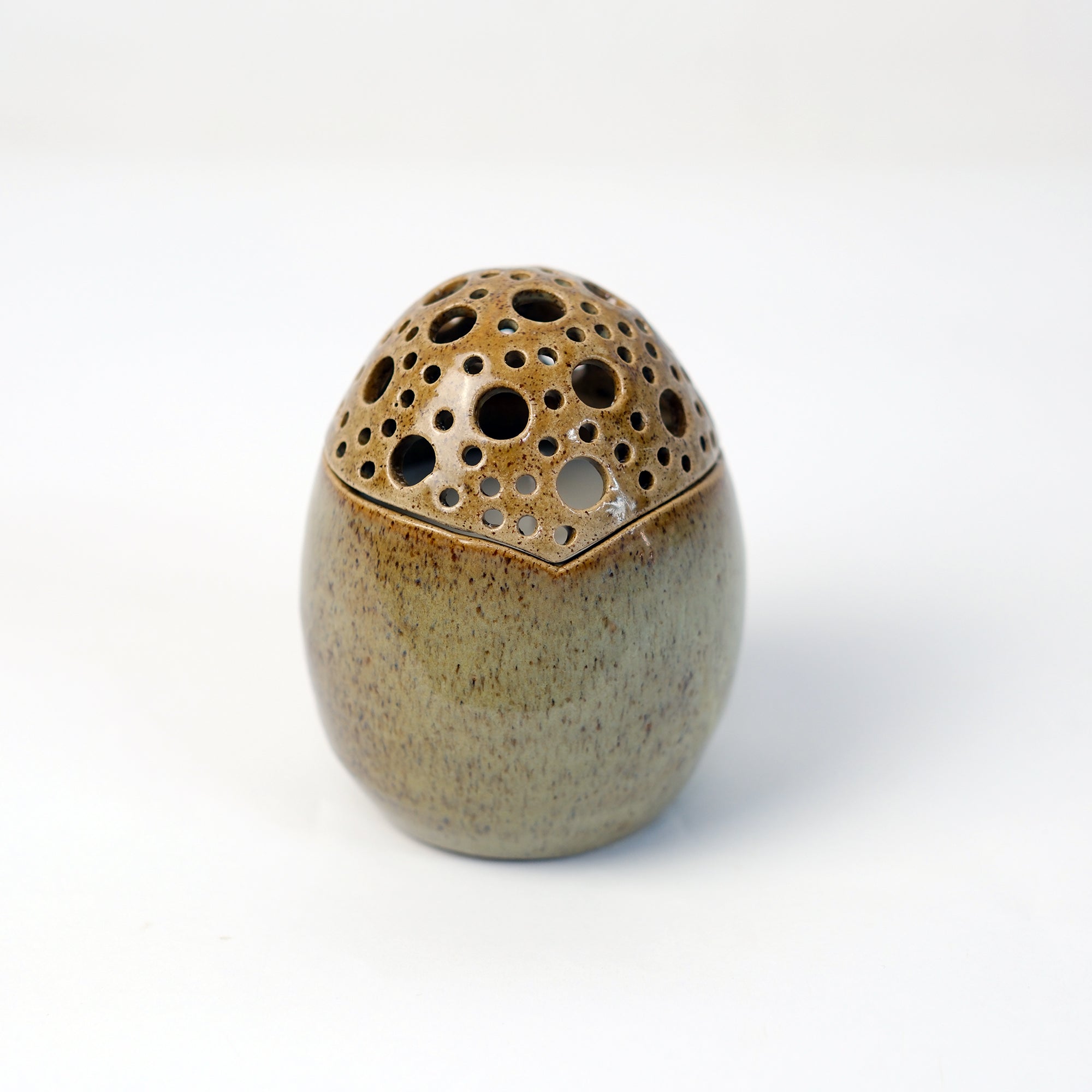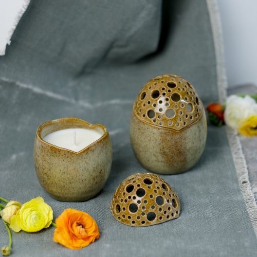 Κεραμικό αυγό τρυπητό φτιαγμένο στο χέρι από stoneware πηλό και γεμισμένο με κερί σόγιας με άρωμα patchouli pomegranate. Ψήνεται στους 1270 °C με αποτέλεσμα να αποκτά μεγάλη αντοχή και να είναι 100% food-safe.