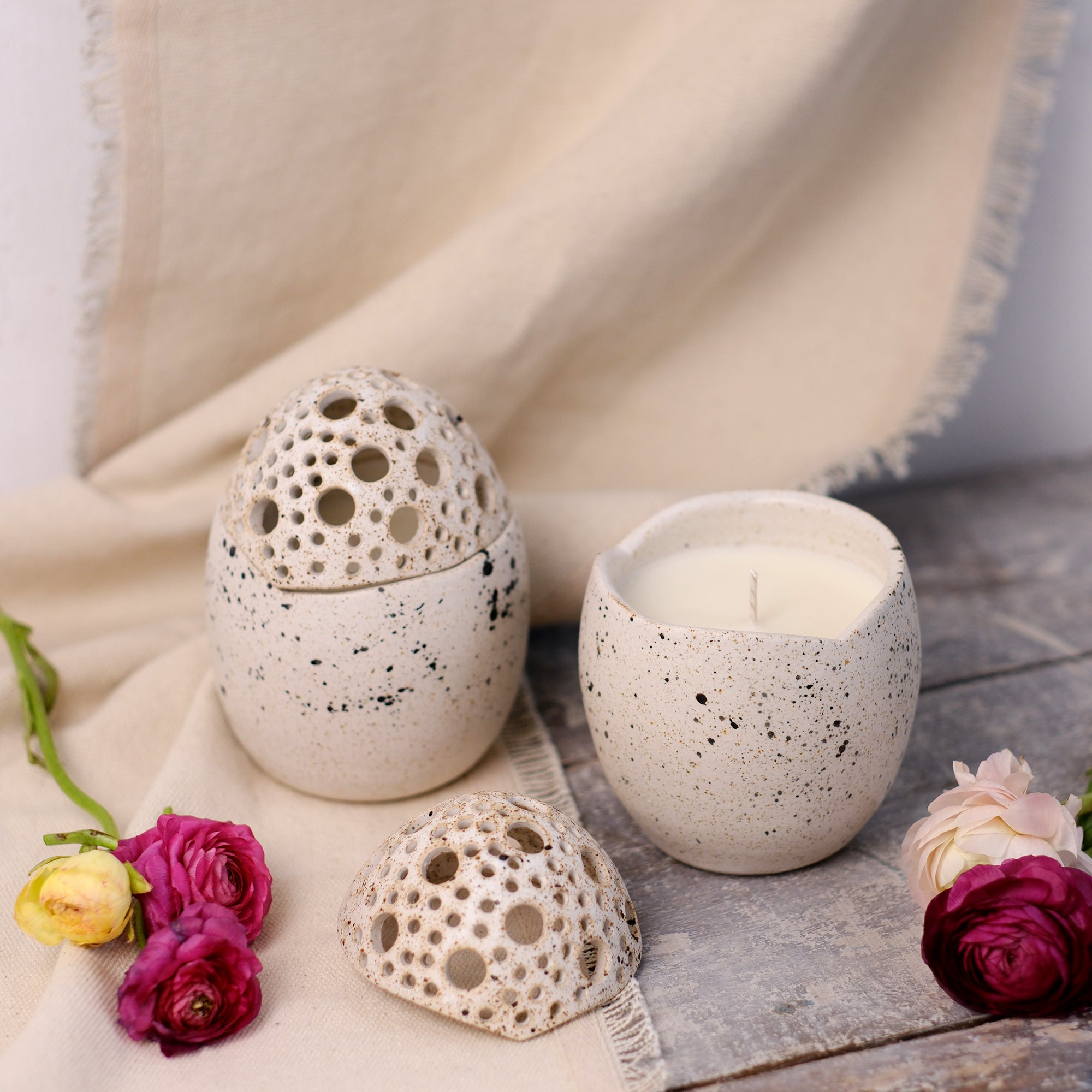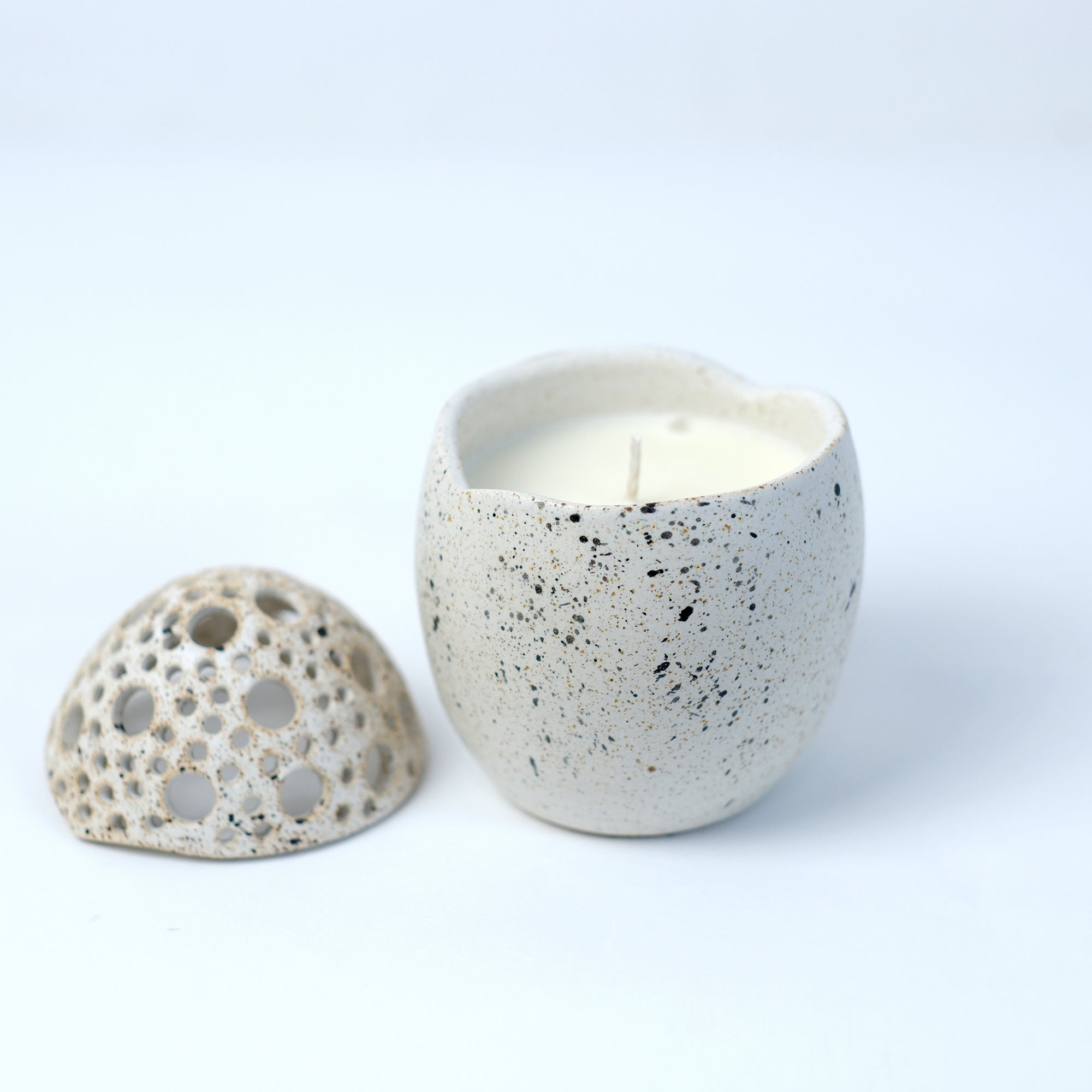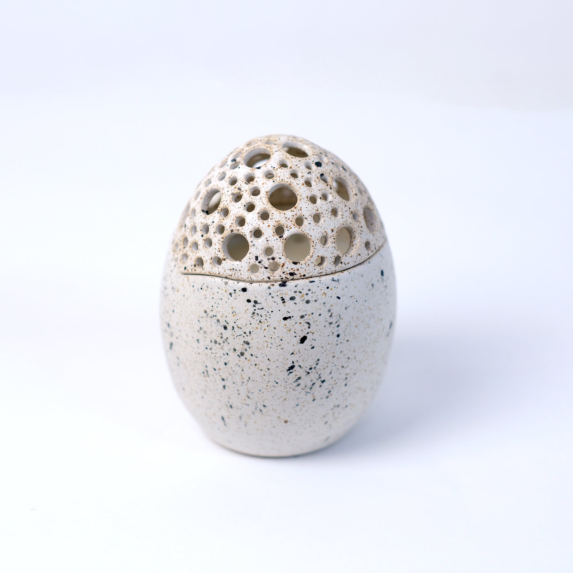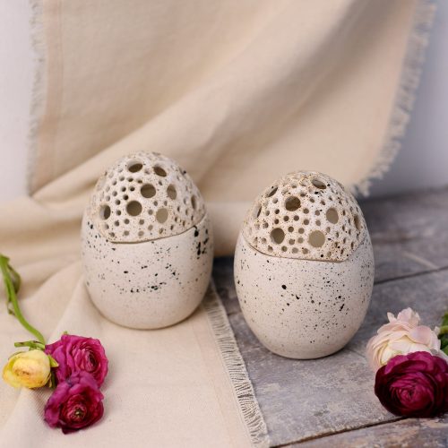 Κεραμικό αυγό τρυπητό φτιαγμένο στο χέρι από stoneware πηλό και γεμισμένο με κερί σόγιας με άρωμα sweet vanilla. Ψήνεται στους 1270 °C με αποτέλεσμα να αποκτά μεγάλη αντοχή και να είναι 100% food-safe.