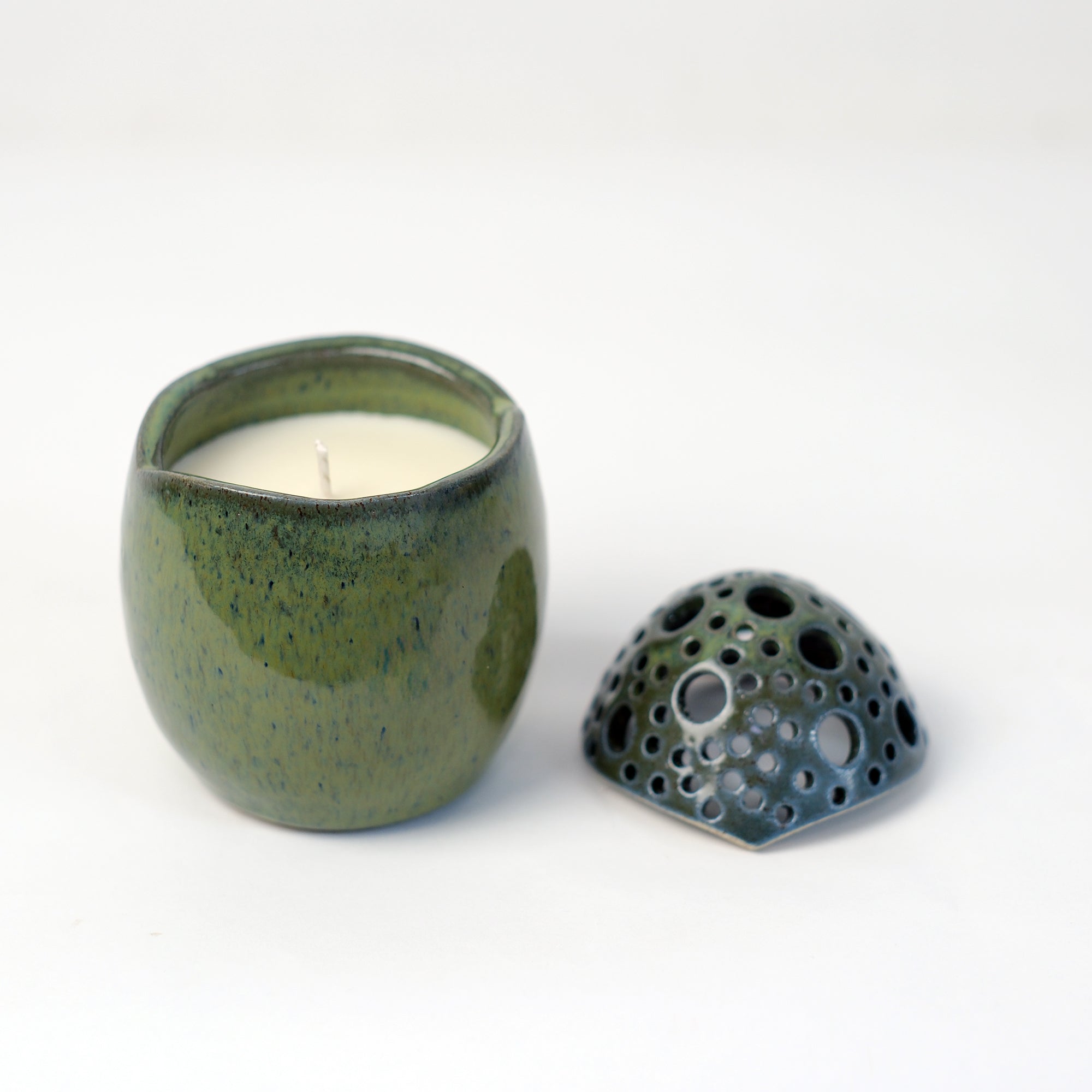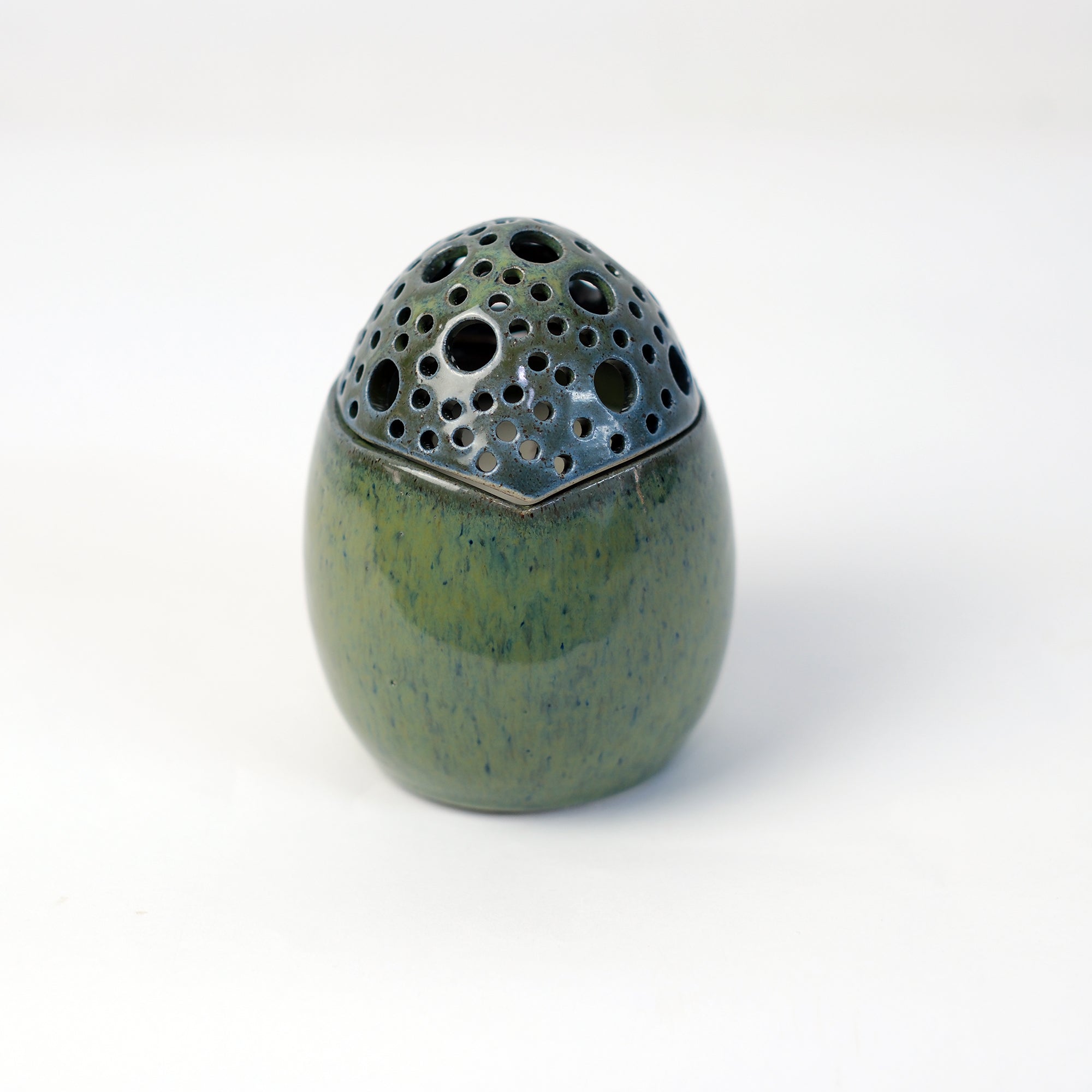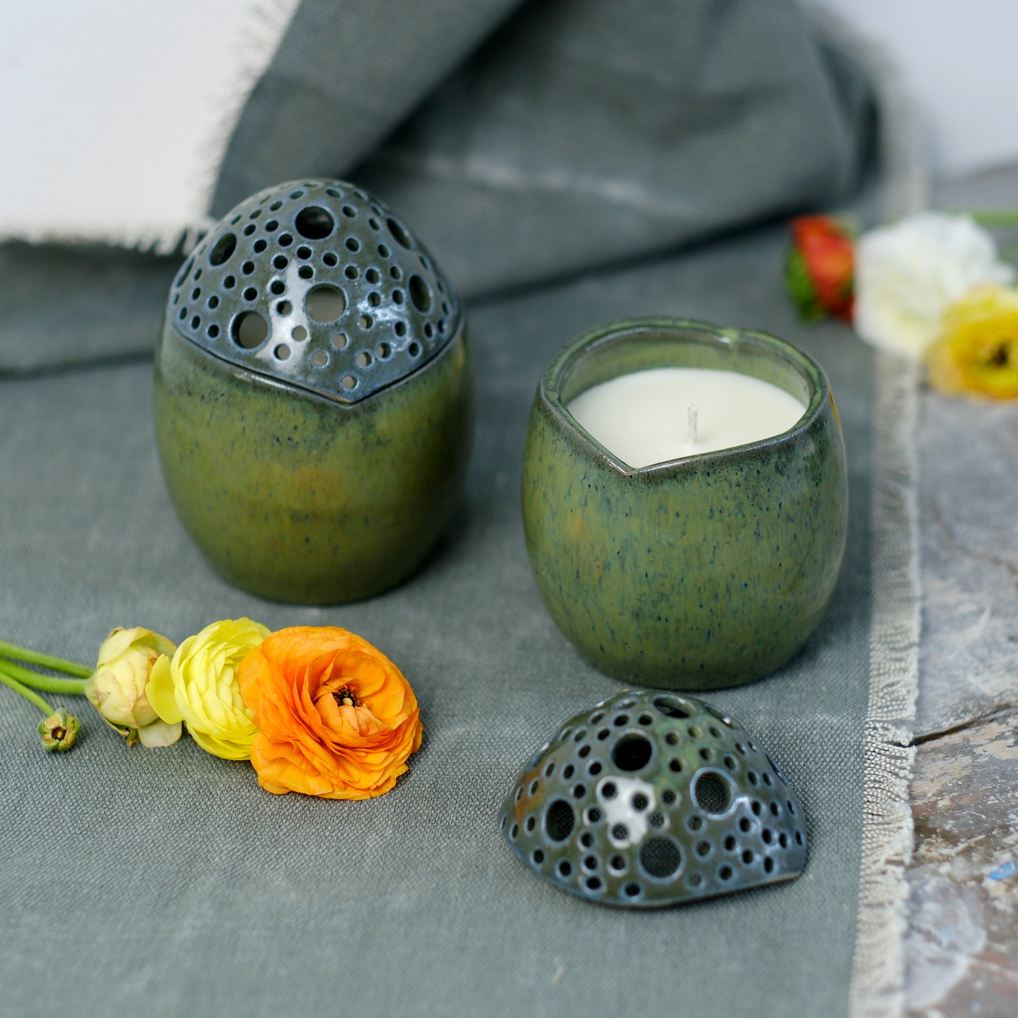 Κεραμικό αυγό φτιαγμένο στο χέρι από stoneware πηλό και γεμισμένο με κερί σόγιας με άρωμα amber olibanum. Ψήνεται στους 1270 °C με αποτέλεσμα να αποκτά μεγάλη αντοχή και να είναι 100% food-safe.